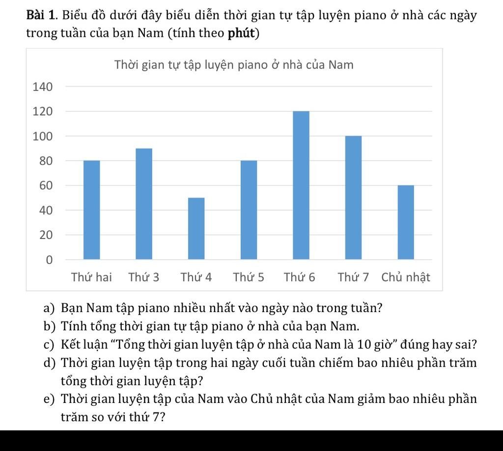 `a)` Bạn Nam tập piano nhiều nhất vào thứ `6`
