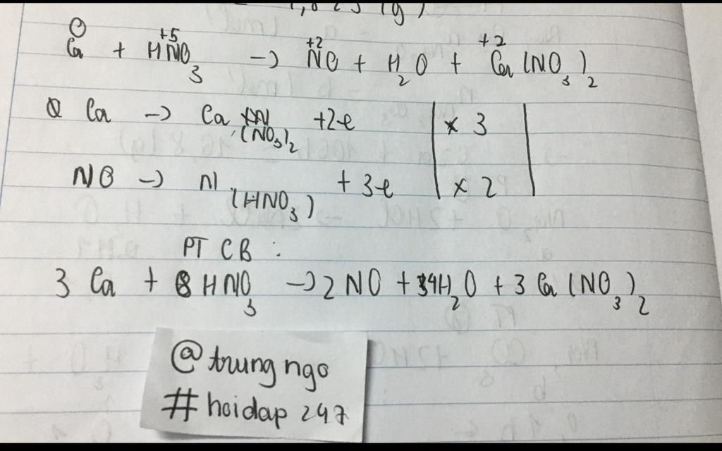 $\mathop{Ca}\limits^{0}+H\mathop{N}\limits^{+5}O_3 \to \mathop{Ca}\limits^{+2}(NO_3)_2+\mathop{N}\limits^{+2}O↑+H_2O$