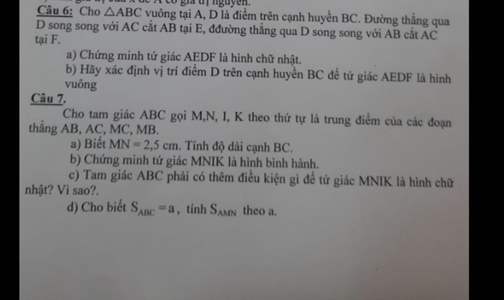 Câu 6: Cho AABC vuông tại A, D là điểm trên cạnh huyền BC. Đường thẳng qua