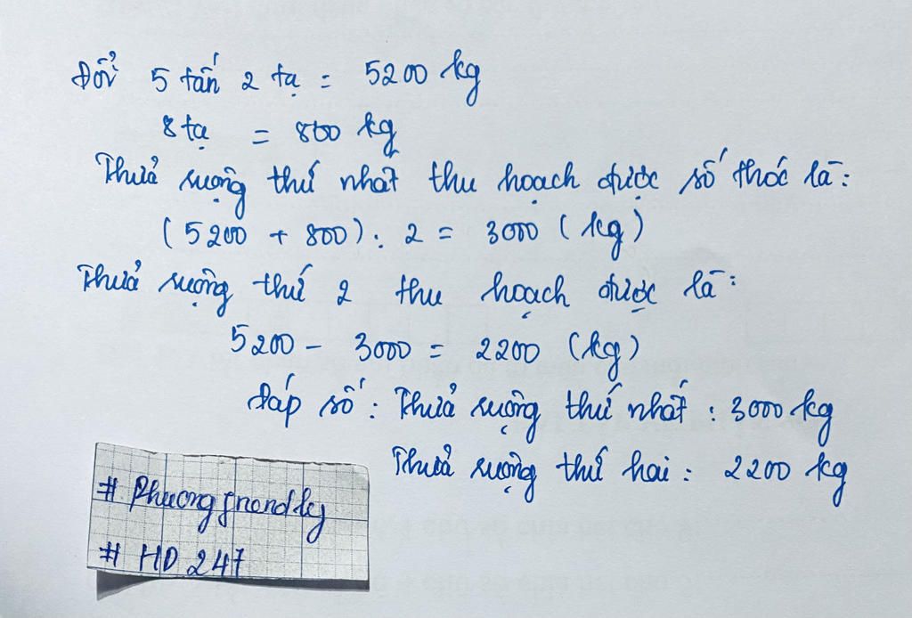 Đổi `5` tấn `2` tạ `=` `5200` kg