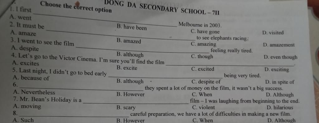Câu 8 bạn sai kìa Câu 6 bảo là although+clause mà câu 8 lại làm thành although+N