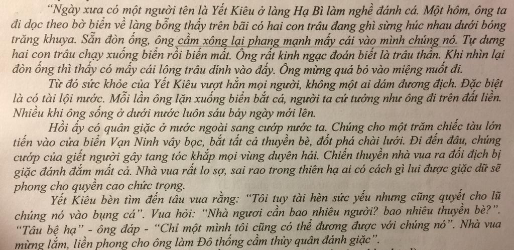 “Một hôm, ông ta đi dọc theo bờ biển về làng bỗng thấy trên bãi có hai con trâu đang ghì sừng húc nhau dưới bóng trăng khuya. Sẵn đòn ống, ông cầm xông lại phang mạnh mấy cái vào mình chúng nó. Tự dưng hai con trâu chạy xuống biển rồi biến mất. Ông rất kinh ngạc đoán biết là trâu thần. Khi nhìn lại đòn ống thì thấy có mấy cái lông trâu dính vào đấy. Ông mừng quá bỏ vào miệng nuốt đi. Từ đó sức khỏe của ông vượt trội hơn người. Đặc biệt là có tài lội nước. Mỗi lần ông lặn xuống biển bắt cá, người ta cứ tưởng như ông đi trên đất liền. Nhiều khi ông sống ở dưới nước luôn sáu bảy ngày mới lên.”