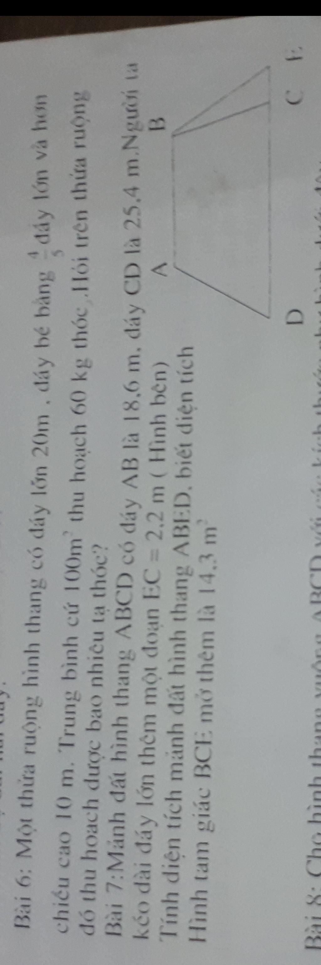 Nhìn vào hình ta thấy chiều cao mảnh đất hình thang ABCD = chiều cao mảnh đất hình tam giác BCE