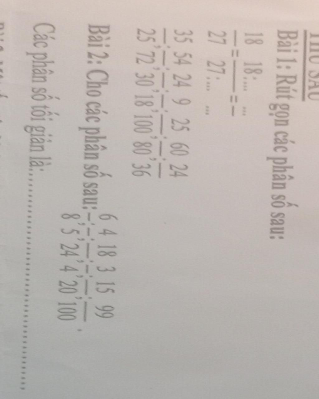 Bài 1: $\frac{18}{27}$ = $\frac{18:9}{27:9}$ =$\frac{2}{3}$