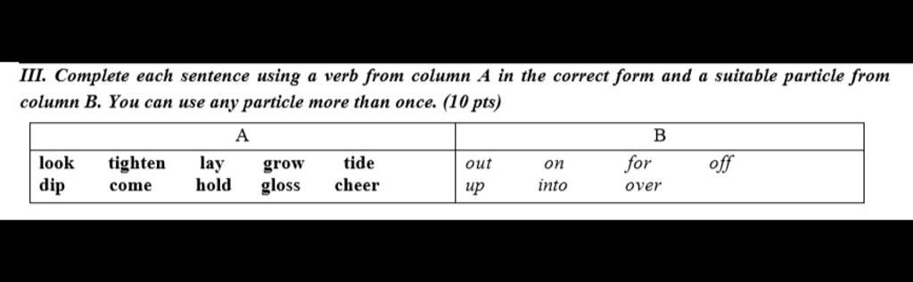 III. Complete each sentence using a verb from column A in the correct form and a suitable particle from