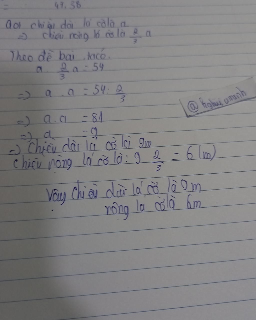 $\textit{⇒ Chiều rộng = $\frac{54}{x}$ = $\frac{54}{9}$ = 6 m.}$