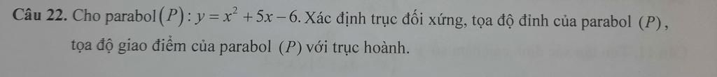Để tìm tọa độ giao điểm của parabol (P) với trục hoành, ta cần tìm điểm x = 0 trên parabol (P). Để làm điều này, chúng ta cần giải hệ phương trình y = x^2 + 5x - 6 với x = 0. Ta sẽ có:
