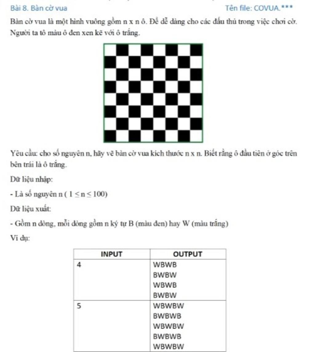Yêu cầu: cho số nguyên n, hãy vẽ bàn cờ vua kích thước n x n. Biết rằng ô đầu tiên ở góc trên