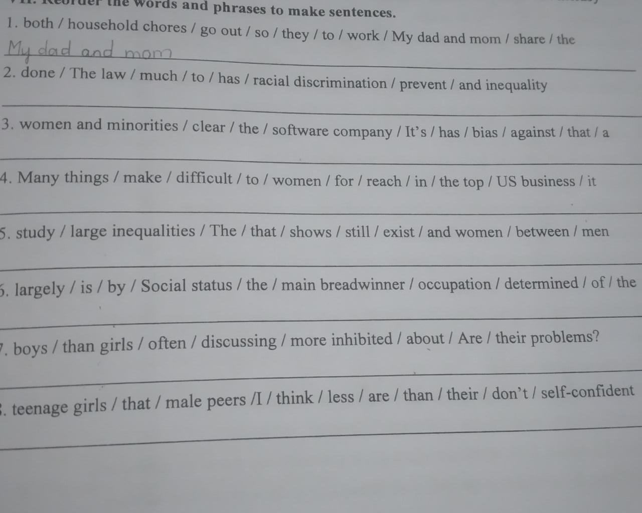 1. My dad and mom both go out to work so they share the household chores.