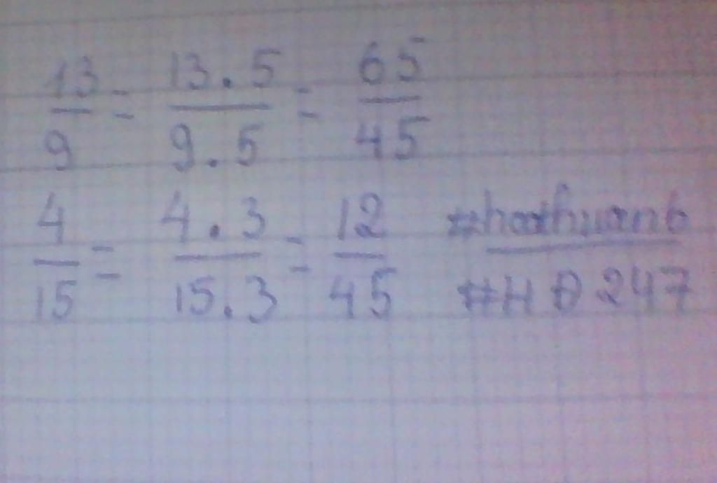 `13/9` `=` `(13 . 5)/(9 . 5)` `=` `65/45`