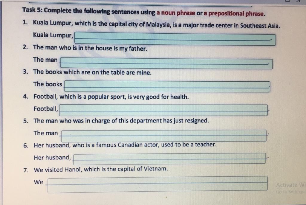 Task 5: Complete the following sentences using a noun phrase or a prepositional phrase.