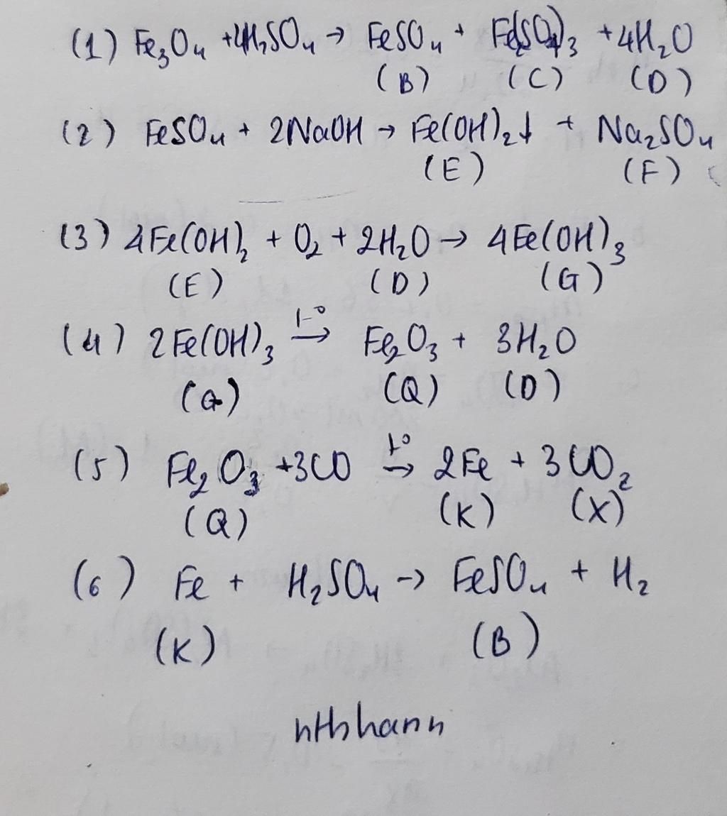 $\rm (1) Fe_3O_4 +4H_2SO_4 \to FeSO_4+Fe_2(SO_4)_3+4H_2O \\ (2) FeSO_4+2NaOH \to Fe(OH)_2\downarrow +Na_2SO_4 \\ (3)4Fe(OH)_2+O_2+2H_2O \to 4Fe(OH)_3\\ (4) 2Fe(OH)_3 \xrightarrow{t^o} Fe_2O_3+3H_2O \\ (5) Fe_2O_3+3CO \xrightarrow{t^o} 2Fe+3CO_2 \\ (6) Fe+H_2SO_4 \to FeSO_4+H_2\uparrow$