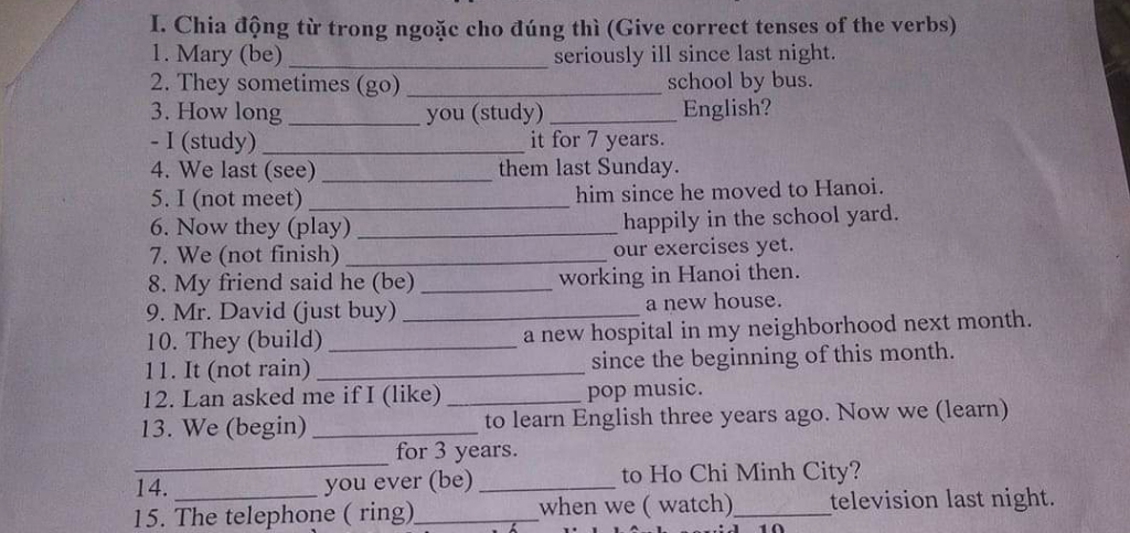 I. Chia động từ trong ngoặc cho đúng thì (Give correct tenses of the verbs)