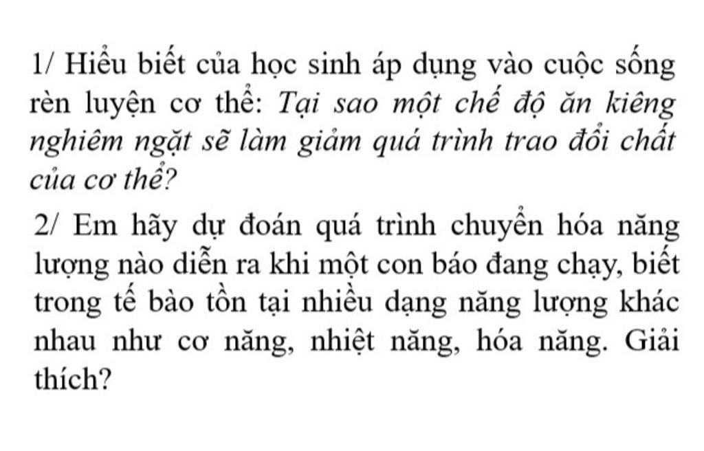 1/ Trả lời như sau: Việc ăn kiêng sẽ làm giảm hàm lượng các chất dinh dưỡng cung cấp cho cơ thể của chúng ta sau đó cơ thể sẽ thiếu nguyên liệu cho quá trình chuyển hóa các chất rồi cuối cùng quá trình trao đổi chất bị chậm lài