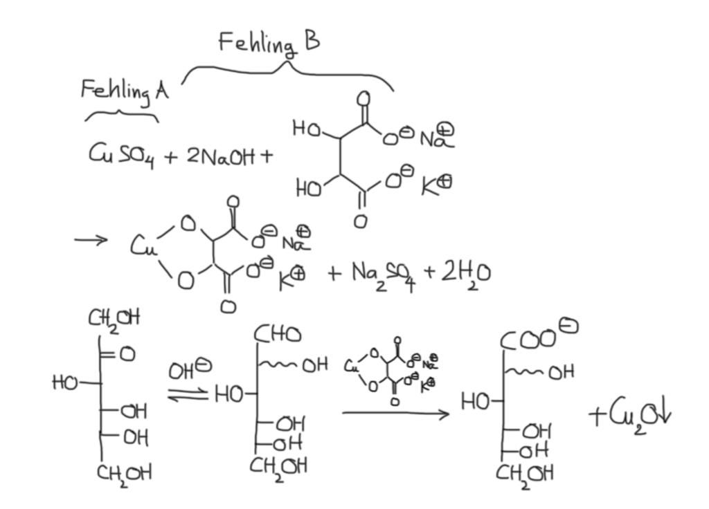 Fructose hỗ biến thành glucose hoặc mannose rồi phản ứng với phức tactrate màu xanh lam tạo ra $Cu_2O$ màu đỏ gạch.