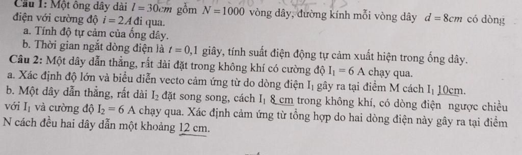 Câu 1: Một ông dây dài 1 = 30cm gồm N=1000 vòng dây, đường kính mỗi vòng dây d =8cm có dòng