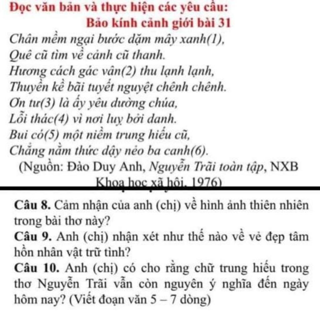 Câu 10: Quả thật, nhắc đến Nguyễn Trãi ta thấy ngay sự trung hiếu. Cho đến ngày nay thơ Nguyễn Trãi vẫn còn nguyên vẹn ý nghĩa của chữ trung hiếu. Như ta biết, Nguyễn Trãi là vị anh hùng suốt đời lo cho dân, cho nước. Ông đã lui về ở ẩn, tránh xa danh vọng nhưng nỗi đau về nước, về dân chưa bao giờ nguôi ngao trong ông. Dù trong bất cứ hoàn cảnh nào, dù có đang ngắm mình với thiên nhiên ông vẫn lo cho vận mệnh đất nước. Nguyễn Trãi quả là một con người trung hiếu.