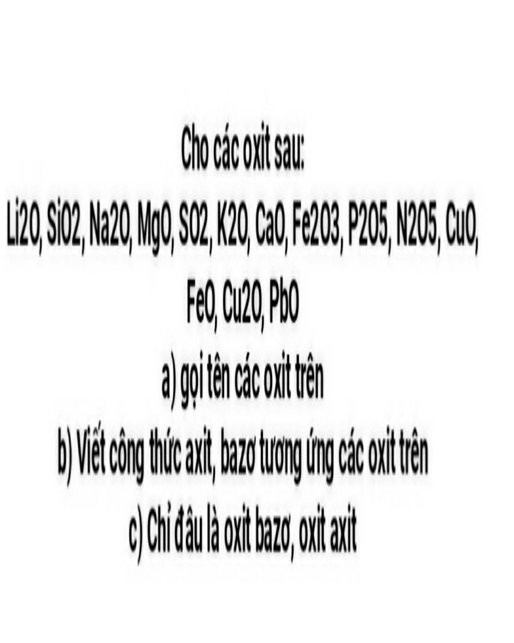 `-` $\text{Oxit bazơ :}$ $Li_2{O}$ , $Na_2{O}$ , `MgO` , $K_2{O}$ , `CaO` , $Fe_2{O_3}$ , `CuO` , `FeO` , $Cu_2{O}$ , `PbO` .
