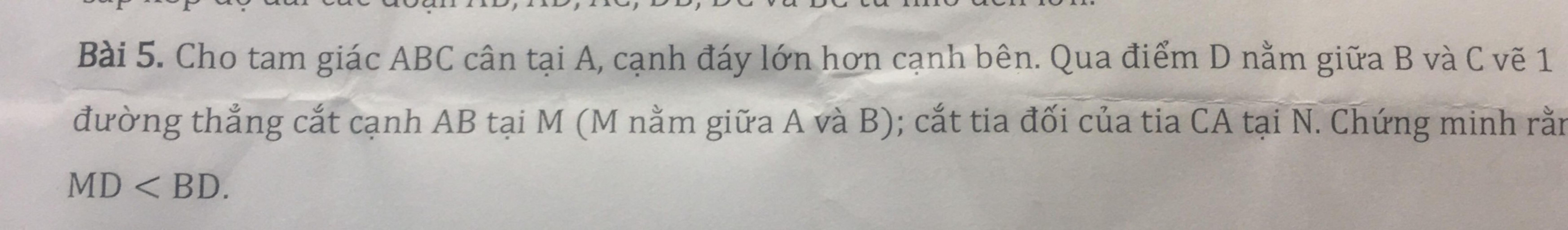 Bài 5. Cho tam giác ABC cân tại A, cạnh đáy lớn hơn cạnh bên. Qua điểm D nằm giữa B và C vẽ 1