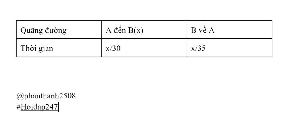 Người quay đi xe máy về A với vận tốc lớn hơn vận tốc lúc đi là `5(km)/h`, nên thời gian về là : `x/35`