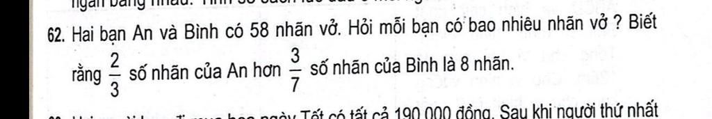 62. Hai bạn An và Bình có 58 nhãn vở. Hỏi mỗi bạn có bao nhiêu nhãn vở ? Biết