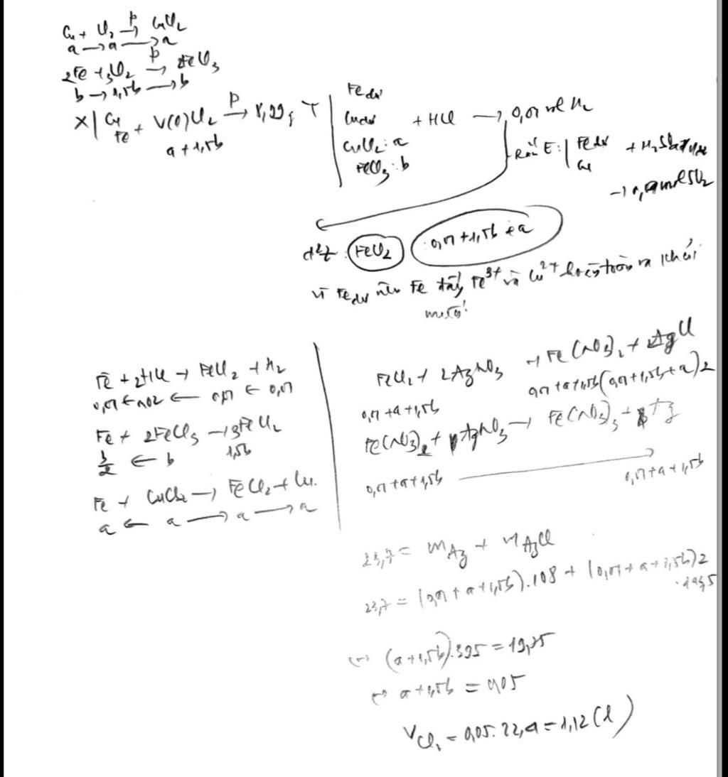 ⇒$\begin{cases} nFe(X)=0,072(mol)\\nCu(X)=0,022(mol)\\nCl2=0,05(mol)\end{cases}$ ⇔$\begin{cases} mFe=4,032(g)\\mCu=1,408(g)\\VCl2=1,12(l)\end{cases}$
