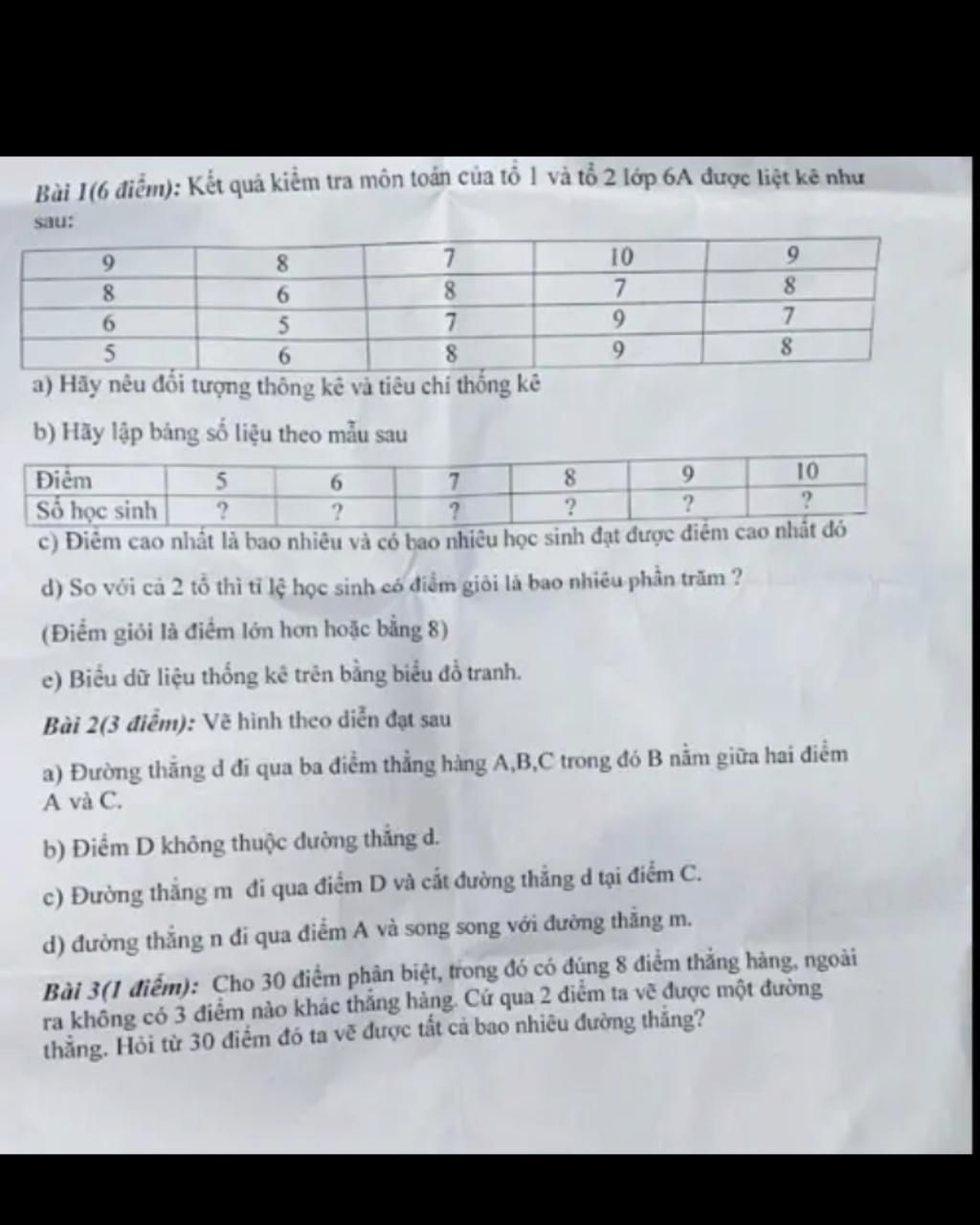 Bài 1(6 điểm): Kết quả kiểm tra môn toán của tổ 1 và tổ 2 lớp 6A được liệt kê như
