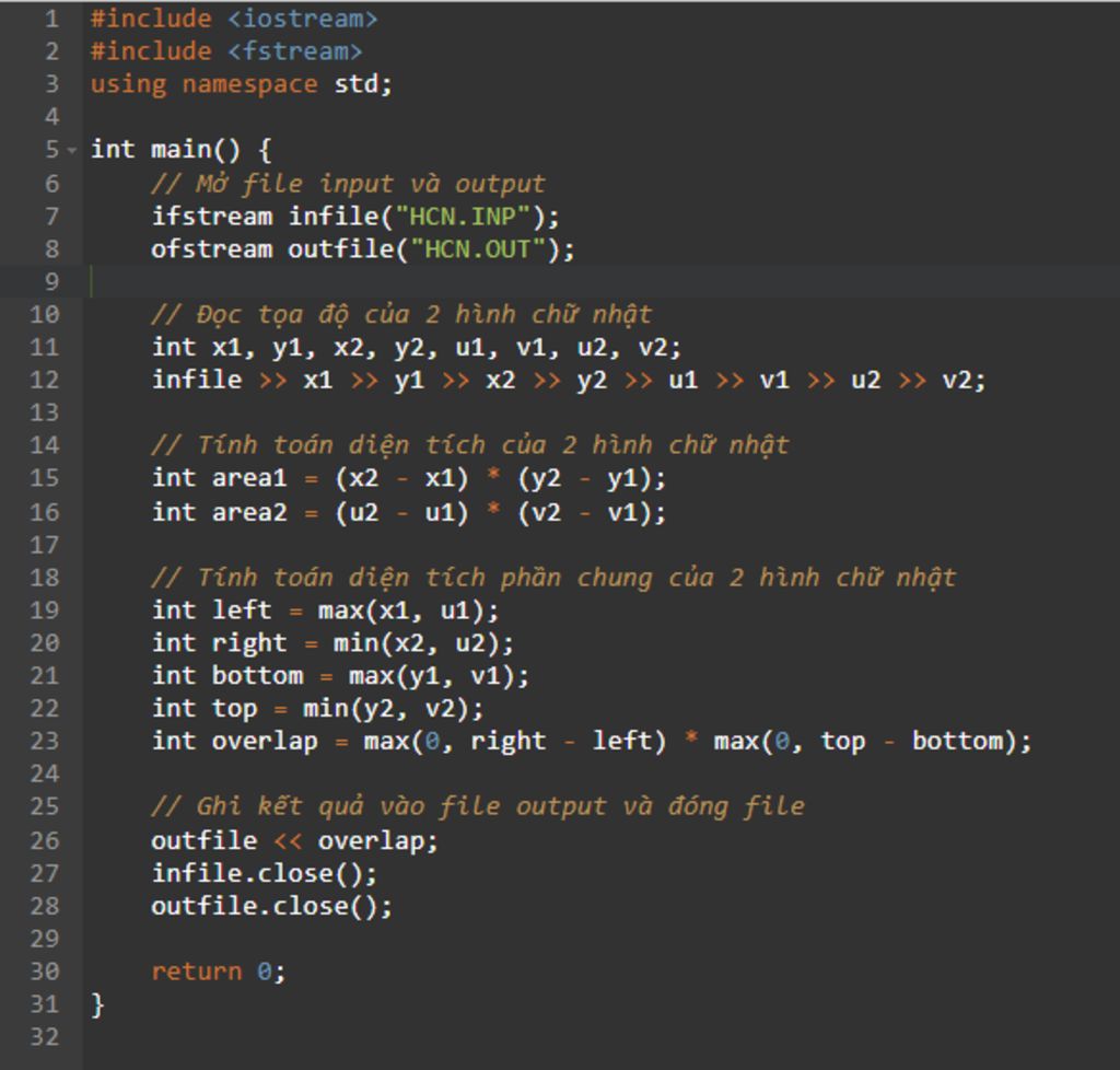 **Chú ý: Code trên sử dụng định dạng input/output bằng file. Bạn cần tạo file HCN.INP và viết dữ liệu vào theo định dạng đã nêu ở trên, sau đó chạy chương trình để tạo file HCN.OUT chứa kết quả của bài toán.