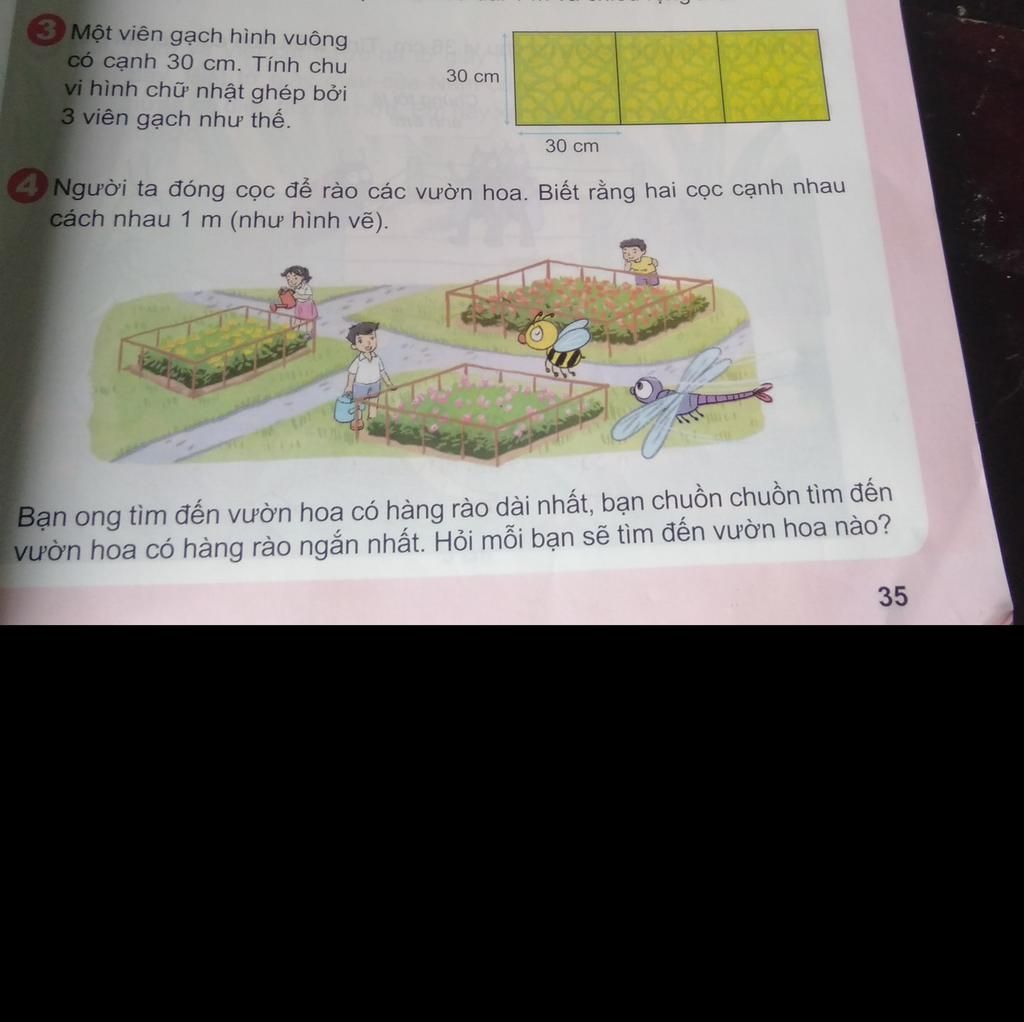 - Vì vườn hoa là hình vuông nên ta đo được cạnh của vườn hoa màu hồng là: 4 $m$.