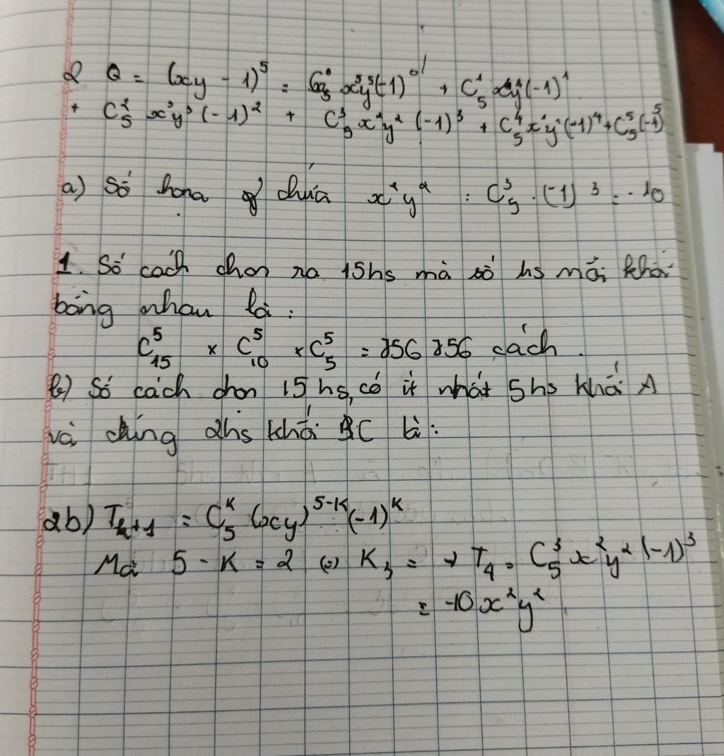 Câu 1: Từ một nhóm 30 học dinh lớp 12 gồm 15 học sinh khối A 10 học sinh khối B và 5 học sinh khối C cần chọn ra 15 học sinh hỏi có bao nhiêu cách chọn sao cho: