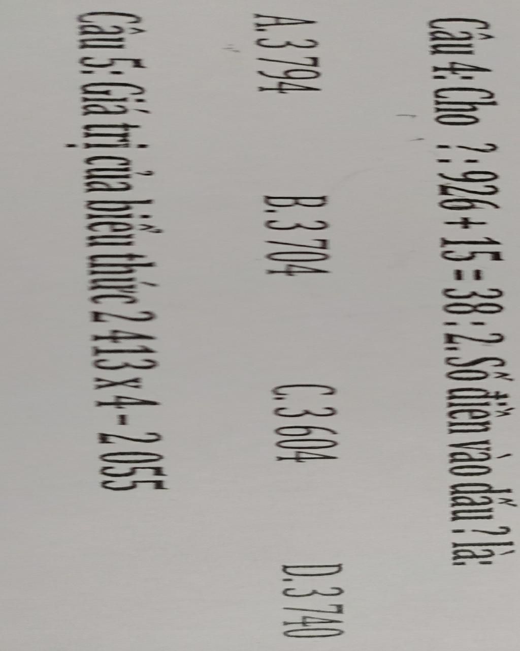 Câu 4 cho ? 926+15=38:2. Số điền vào dấu ?là