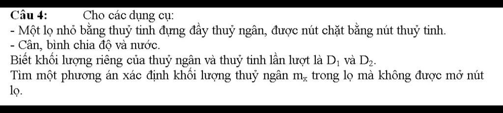 Đặt lọ thủy tinh có chứa thủy ngân vào bình chia độ, sau đó đổ nước sao cho vừa ngập lọ thủy tinh rồi đọc số chỉ ở bình chia độ là ` V_3 ` $(m^3)$