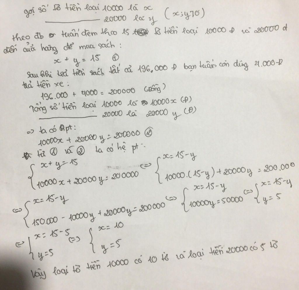 Bạn Tuấn đem theo 15 tờ tiền loại 10.000 đồng và 20.000đồng đến cửa hàng để mua sách . Sau khi trả tiền sách tất cả 196.000 đồng bạn Tuấn còn đúng 4.000 đồng trả tiền xe . Hỏi bạn Tuấn có bao nhiêu tờ tiền mỗi loại ?