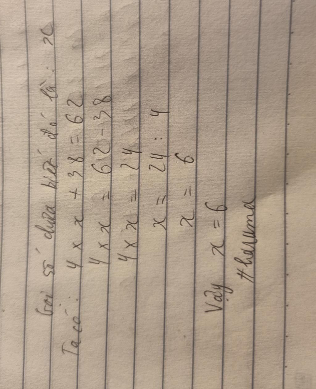 Giải thích các bước giải: `4xx...+38=62`