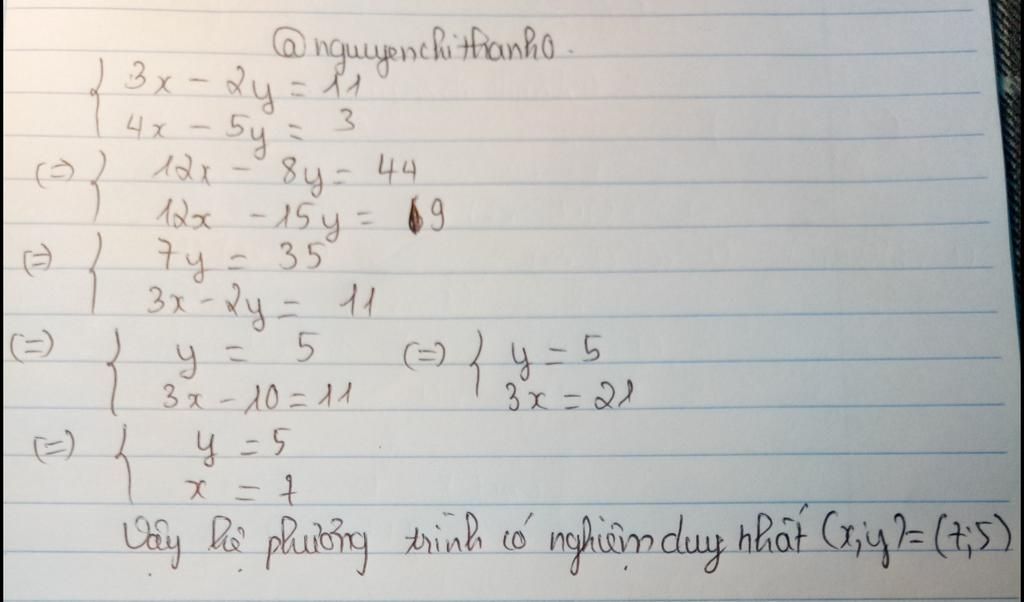 Vậy hệ phương trình có nghiệm duy nhất `{(x=7),(y=5):}`