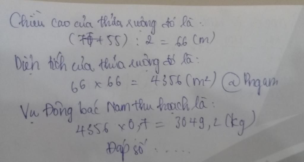 Nhà bác nam được thôn chia cho một thửa ruộng hình thang , có hai đáy lần lượt là 77m và 55m , chiều cao thửa ruộng bằng trung bình cộng của hai đáy . Vụ đông vừa qua bác nam trồng ngô trên thửa ruộng đó ,trung bình mỗi m2 thu hoạch được 0,7 kg ngô. Hỏi vụ đông vừa qua bác nam thu hoạch được bao nhiêu kg ngô trên cả thửa ruộng đó.