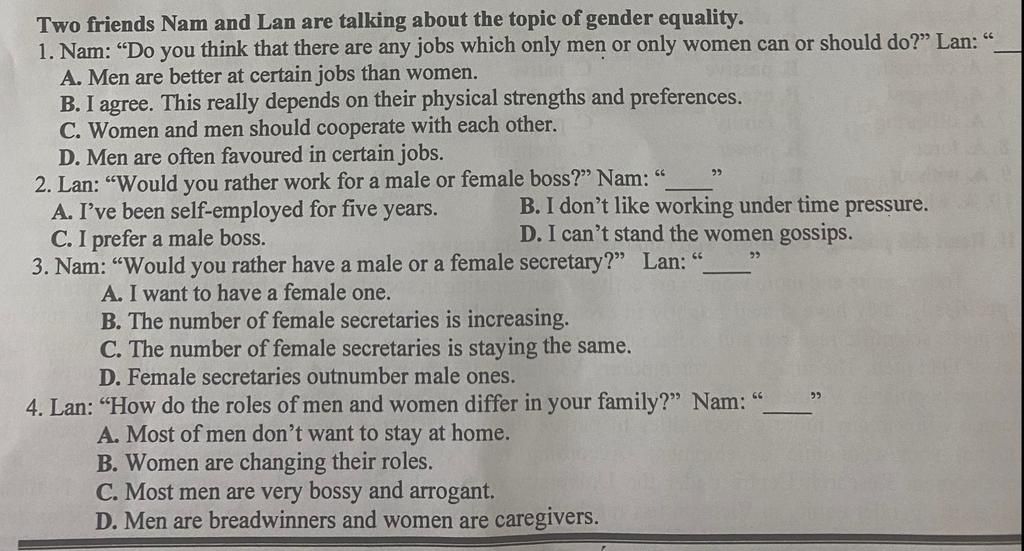 `-` Bạn có nghĩ rằng có bất kỳ công việc nào mà chỉ đàn ông hoặc phụ nữ mới có thể hoặc nên làm không?