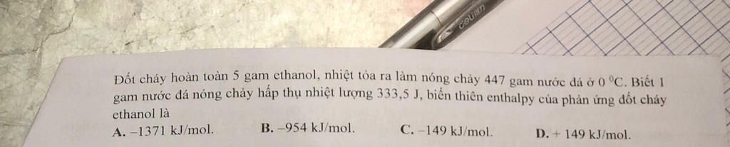 gam nước đá nóng chảy hấp thụ nhiệt lượng 333,5 J, biển thiên enthalpy của phản ứng đốt cháy