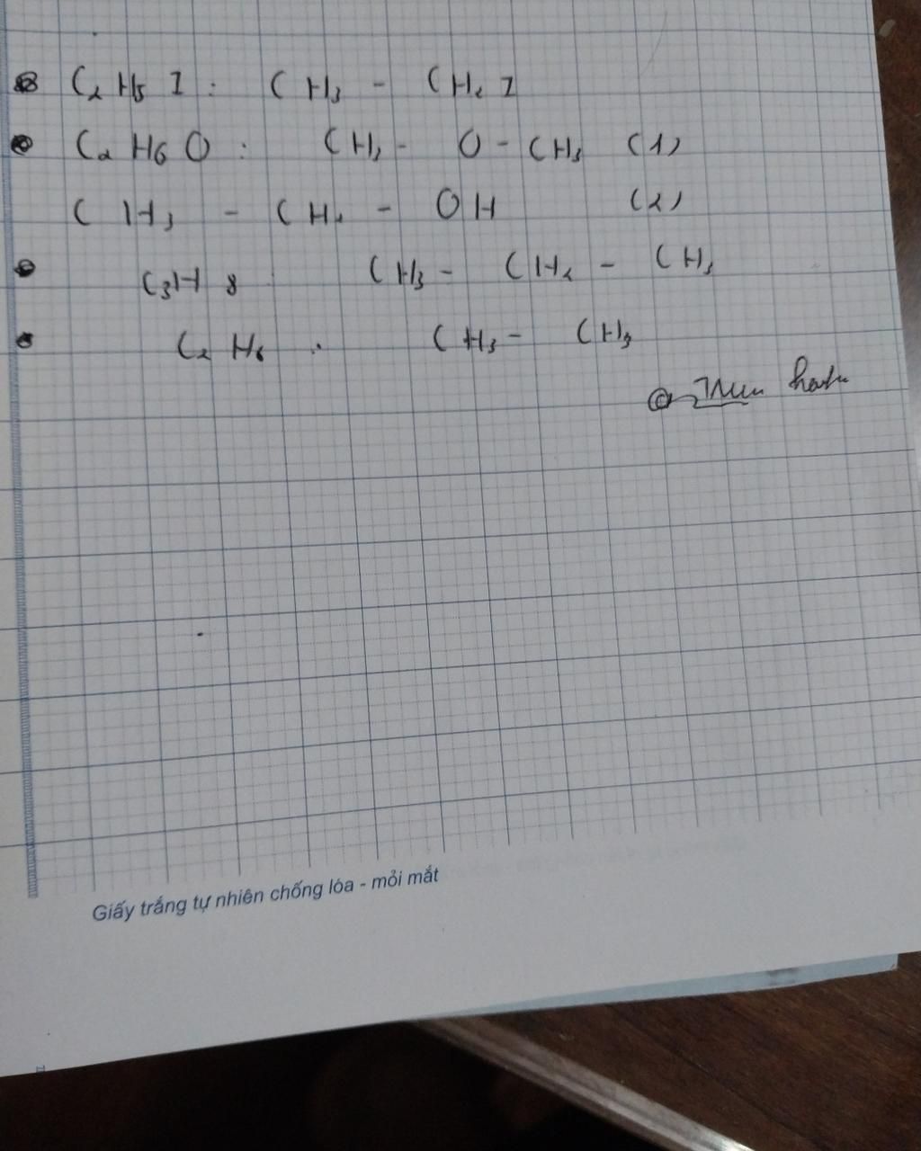 viết tất cả công thức cấu tạo có thể của các chất hữu cơ sau:C2H5I,C2H6O,C3H8,C2H6