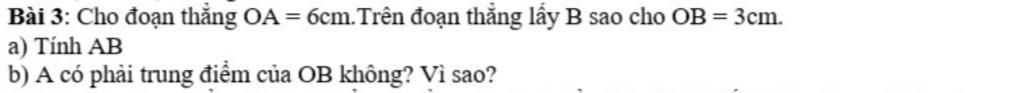 $\text{OA - OB = 6 - 3 = 3 ( cm )}$