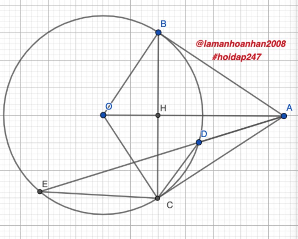 Đề bài. Từ một điểm A nằm ngoài đường tròn (O), kẻ hai tiếp tuyến AB, AC với đường tròn (O) ( B,C là hai tiếp điểm ). Gọi H là giao điểm của hai đường thẳng AO và BC. Qua A kẻ cát tuyến ADE với đường tròn (O) ( D ,E thuộc (O) ) sao cho tia AE nằm giữa hai tia AO, AC và AD < AE.