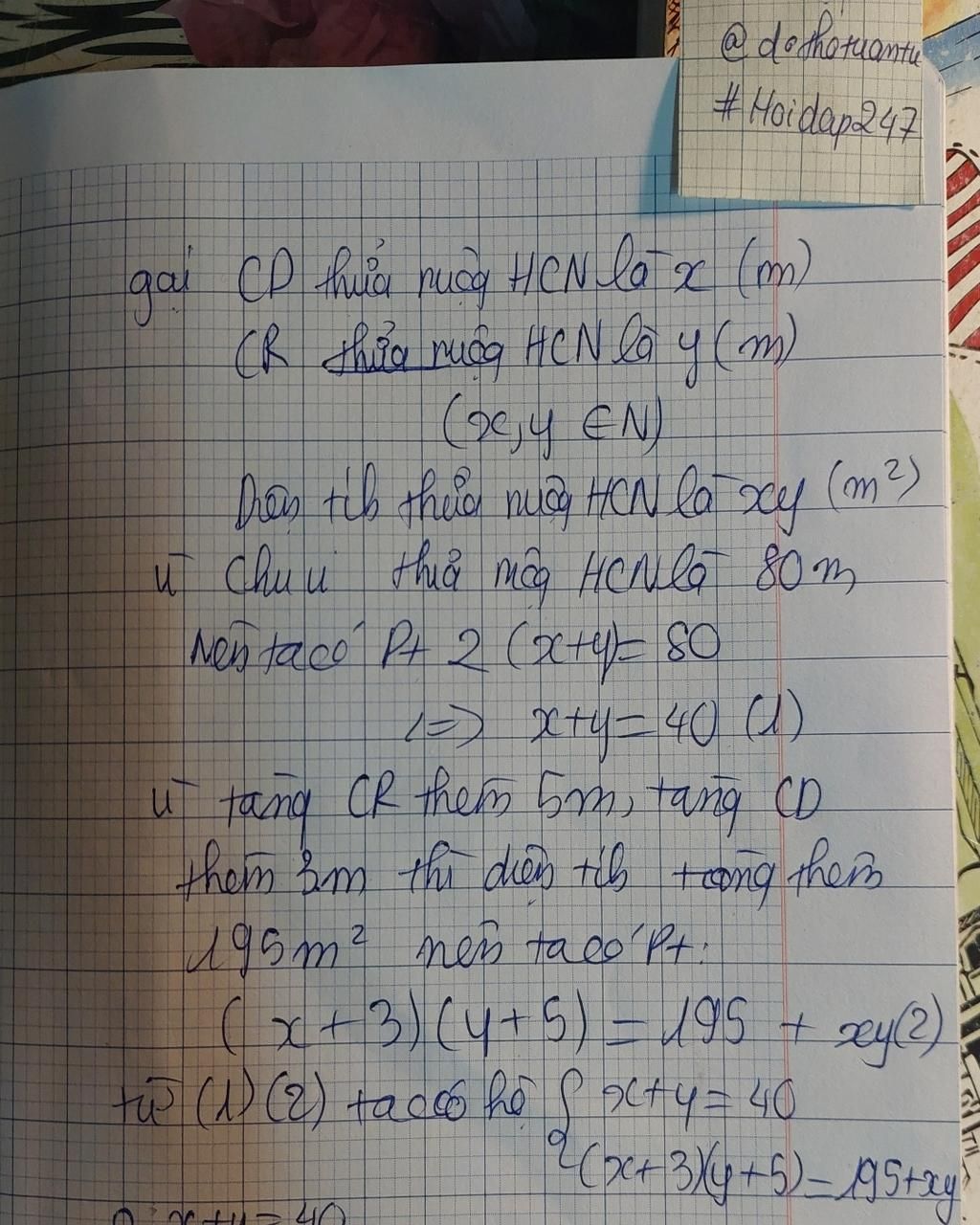 $\left \{ {{2(x+y)=80} \atop {(x+3).(y+5)=xy+195}} \right.=>$ $\left \{ {{2x+2y=80} \atop {xy+5x+3y+15=xy+195}} \right.=>$ $\left \{ {{2x+2y=80} \atop {5x+3y=180}} \right.=>$ $\left \{ {{x=30} \atop {y=10}} \right.$