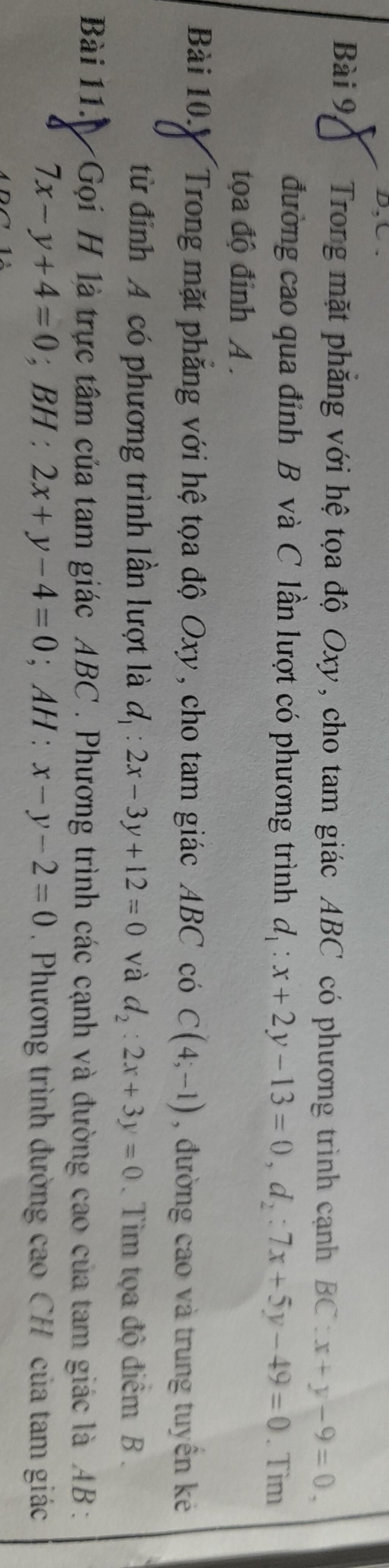 ài 9. Trong mặt phẳng với hệ tọa độ Oxy, cho tam giác ABC có phương trình cạnh BC:x+y-9=0,