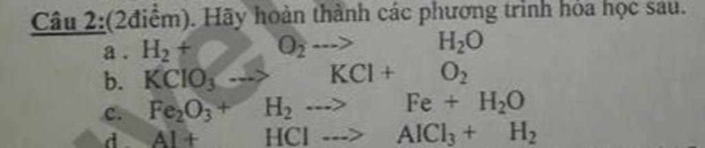 $\rm a, 2H_2+O_2 \xrightarrow{t^o} 2H_2O \\ b, 2KClO_3 \xrightarrow{t^o}2KCl+3O_2 \\ c, Fe_2O_3+3H_2 \xrightarrow{t^o} 2Fe+3H_2O \\ d, 2Al+6HCl \to 2AlCl_3+2H_2$