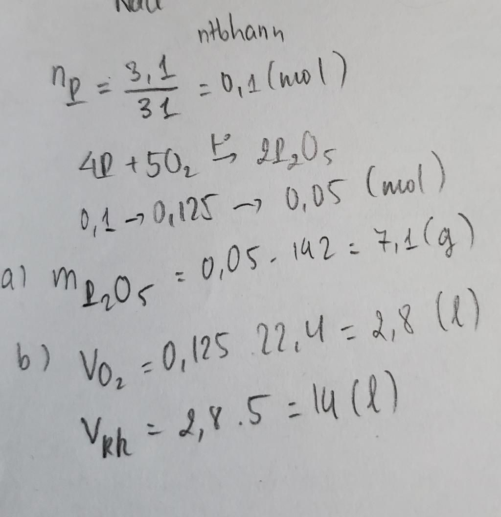 $\rm n_P=\dfrac{3,1}{31}=0,1(mol)\\4P+5O_2\xrightarrow[]{t^o}2P_2O_5\\0,1...0,125....0,05 (mol)\\m_{P_2O_5}=0,05.142=7,1(g)\\V_{O_2}=0,125.22,4=2,8(l)\\V_{kk}=2,8.5=14(l)$Đáp án: