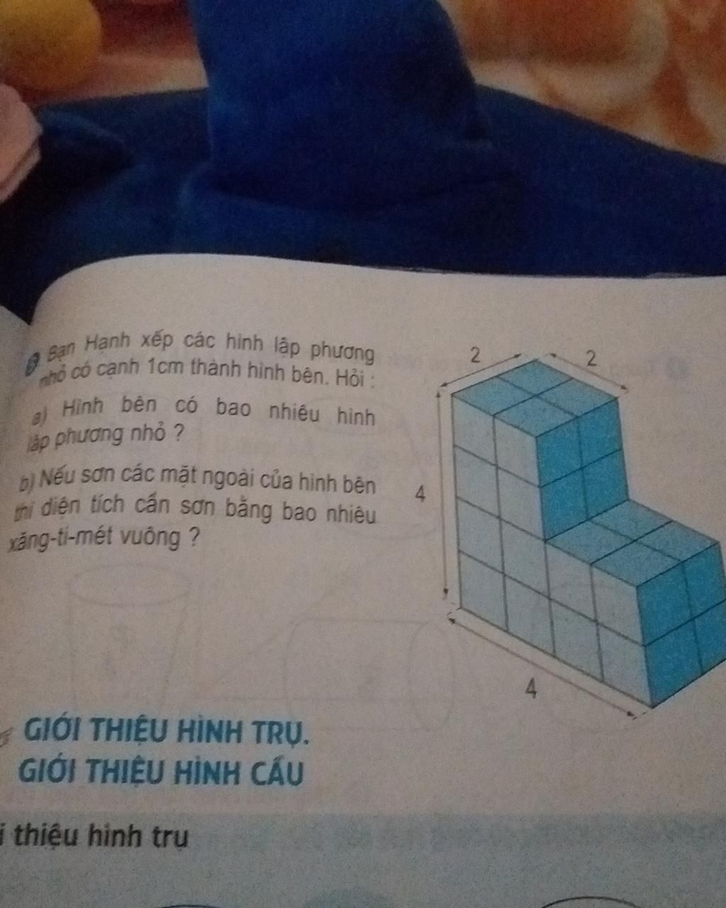 a) Hình theo đề bài gồm 3 khối lập phương lớn, mỗi khối được xếp bởi 8 hình lập phương nhỏ, vậy hình vẽ có tất cả: 8 × 3 = 24 (hình lập phương nhỏ)