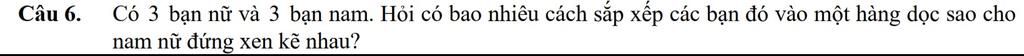 Vậy có tổng cộng $36+36=72$ cách sắp xếp $3$ bạn nam và $3$ bạn nữ vào $1$ hàng dọc để các bạn nam và nữ xen kẽ nhau