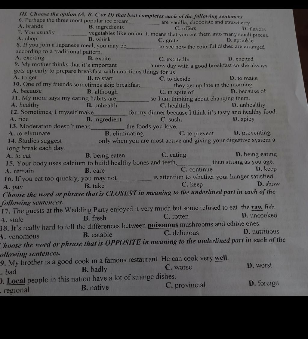 III. Choose the option (A, B, C or D) that best completes each of the following sentences.