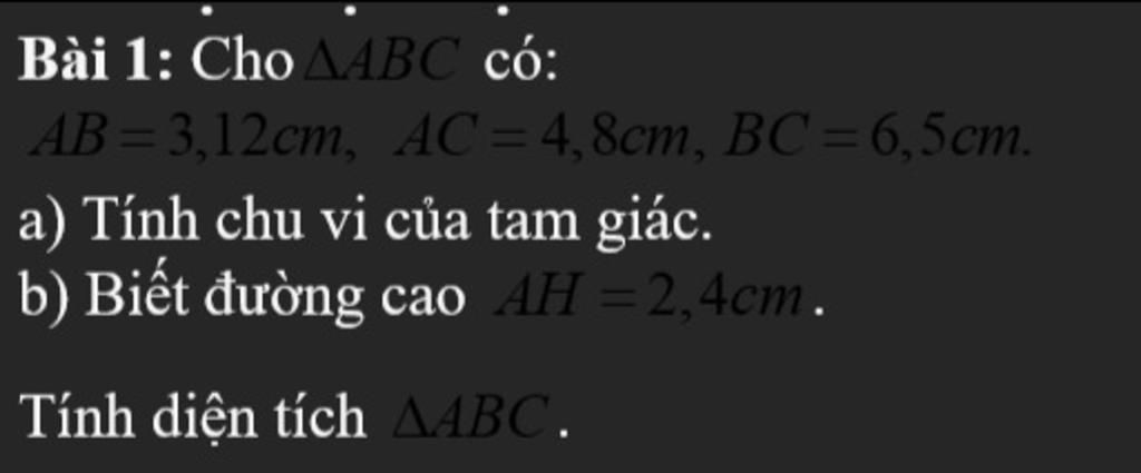 `S_[ABC]=[a.h]/2=[BC .AH]/2=[6,5 . 2,4]/2=7,8(cm^2)`