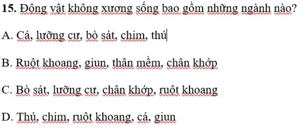 `=>` Câu `B.` Ruột khoang, giun, thân mềm, chân khớp thuộc nhóm động không không xương sống nên đây là đáp án chính xác nhất.